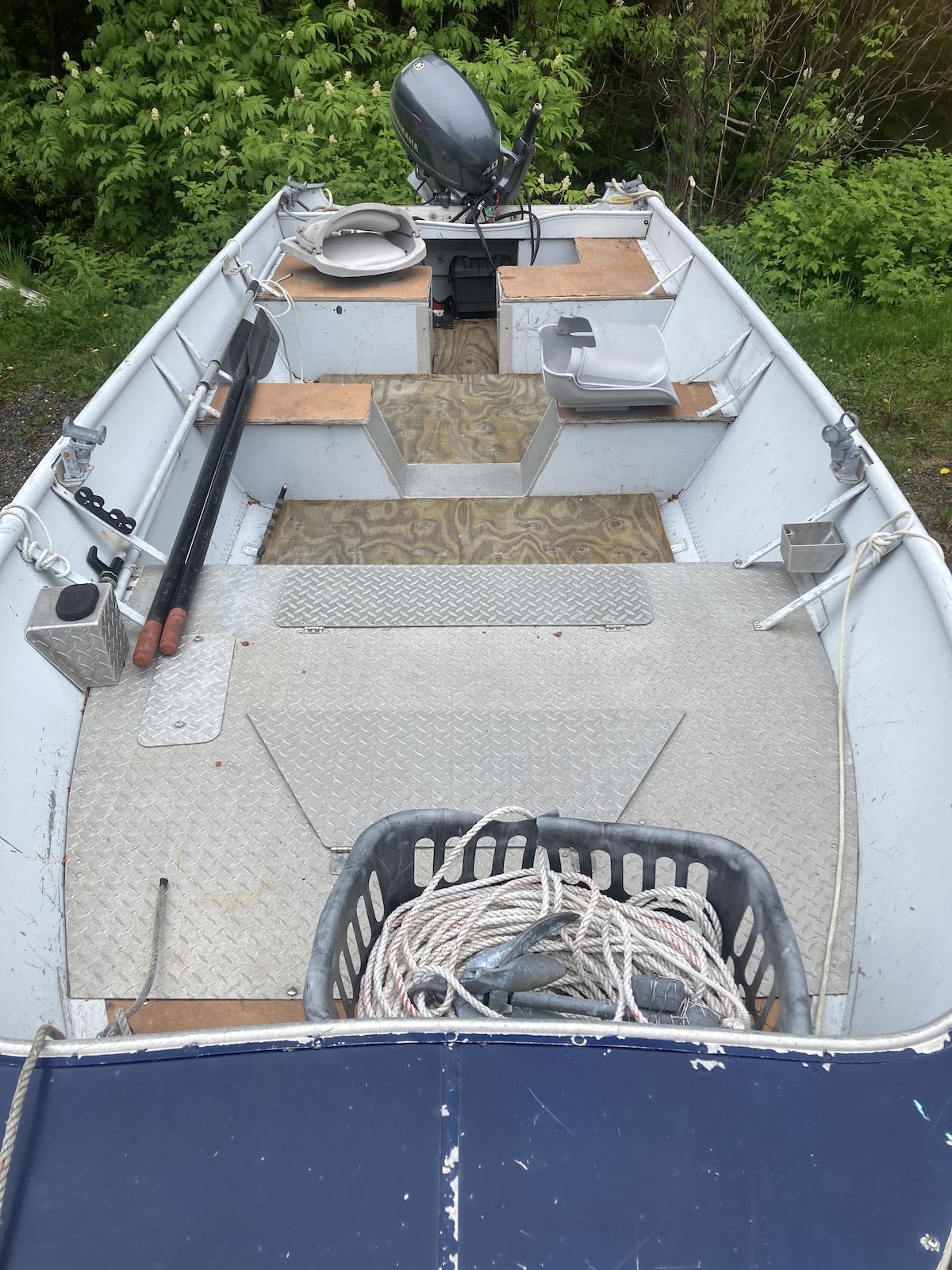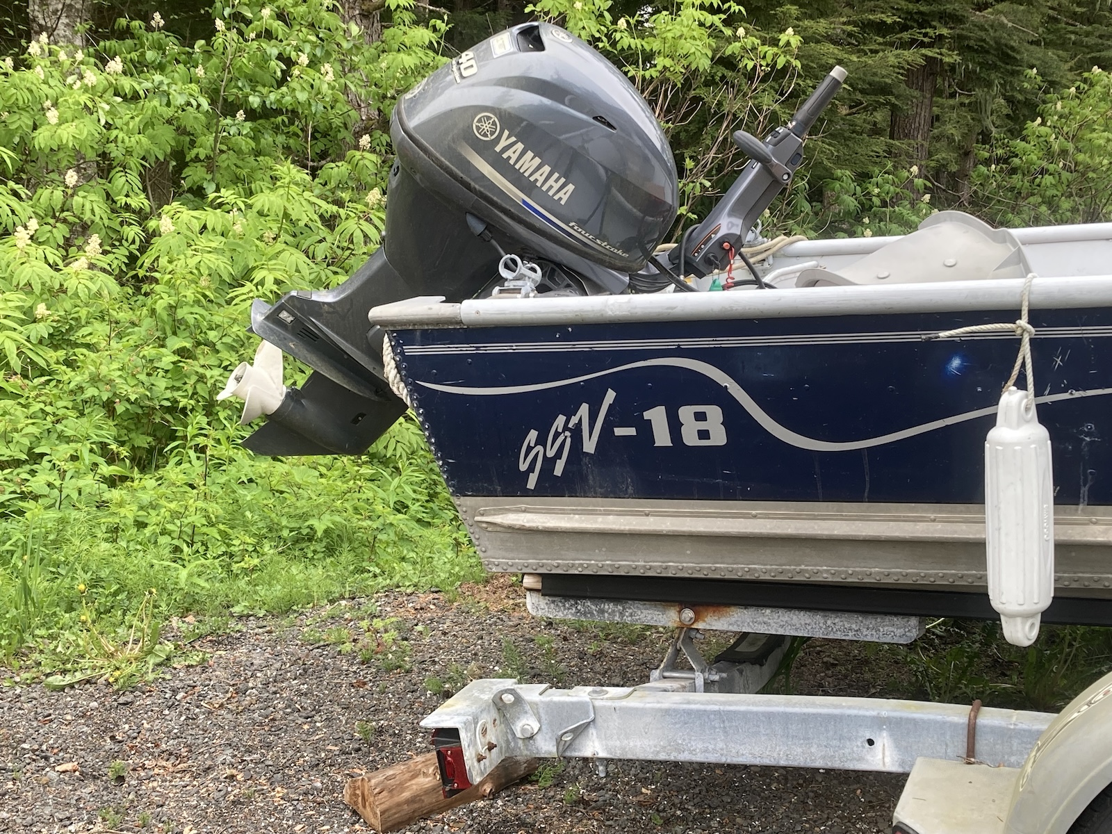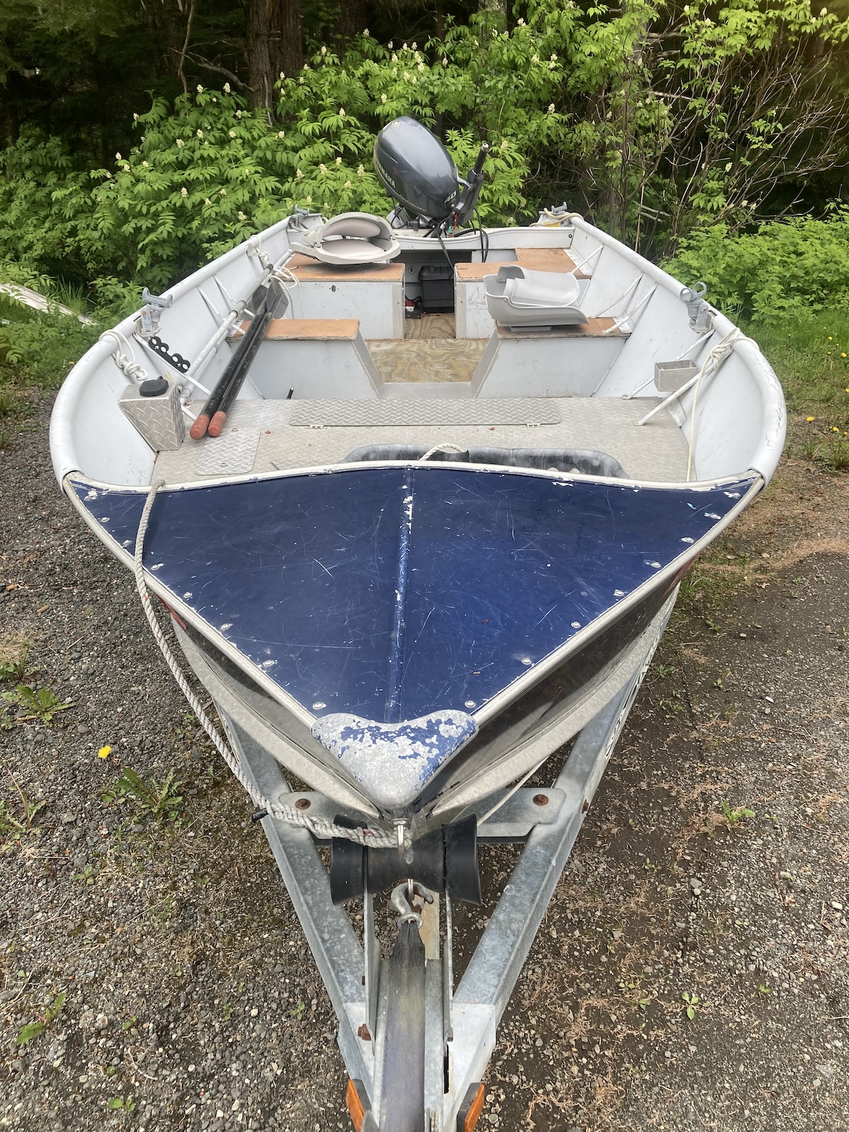 18′ Lund on a trailer. Fully equipped with anchor, paddles, seats, Yahama 40 HP engine.